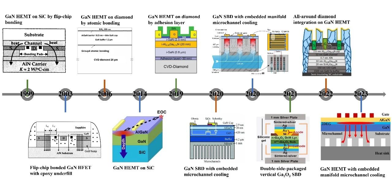 该综述涵盖从器件内部结构优化(包括版图优化、衬底减薄、高热导率衬底键合与覆层)至外部热增强策略(如倒装芯片封装、微通道主动冷却及瞬态热管理技术)的全链条技术体系。深入探讨了当前技术瓶颈、潜在解决方案及未来发展机遇,旨在突破关键散热技术壁垒,推动宽禁带与超宽禁带半导体的深度产业化进程。