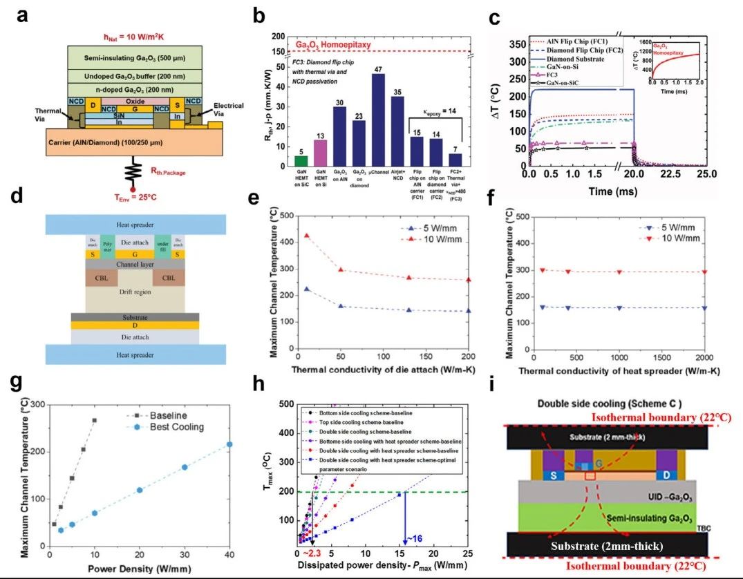 图12。(a)采用NCD钝化技术的倒装芯片Ga2O3 MOSFET结构示意图。(b)结构与封装热阻对比。(c)不同器件结构的温度差随时间变化曲线。(d)CAVET器件结构示意图。(e)底部冷却与(f)双侧冷却的CAVET器件仿真结果。(g)相对温度随直流功率密度变化关系图。(h)不同冷却方案下的最大温度与耗散功率密度关系图。(i)双侧冷却Ga2O3 MOSFET结构示意图。