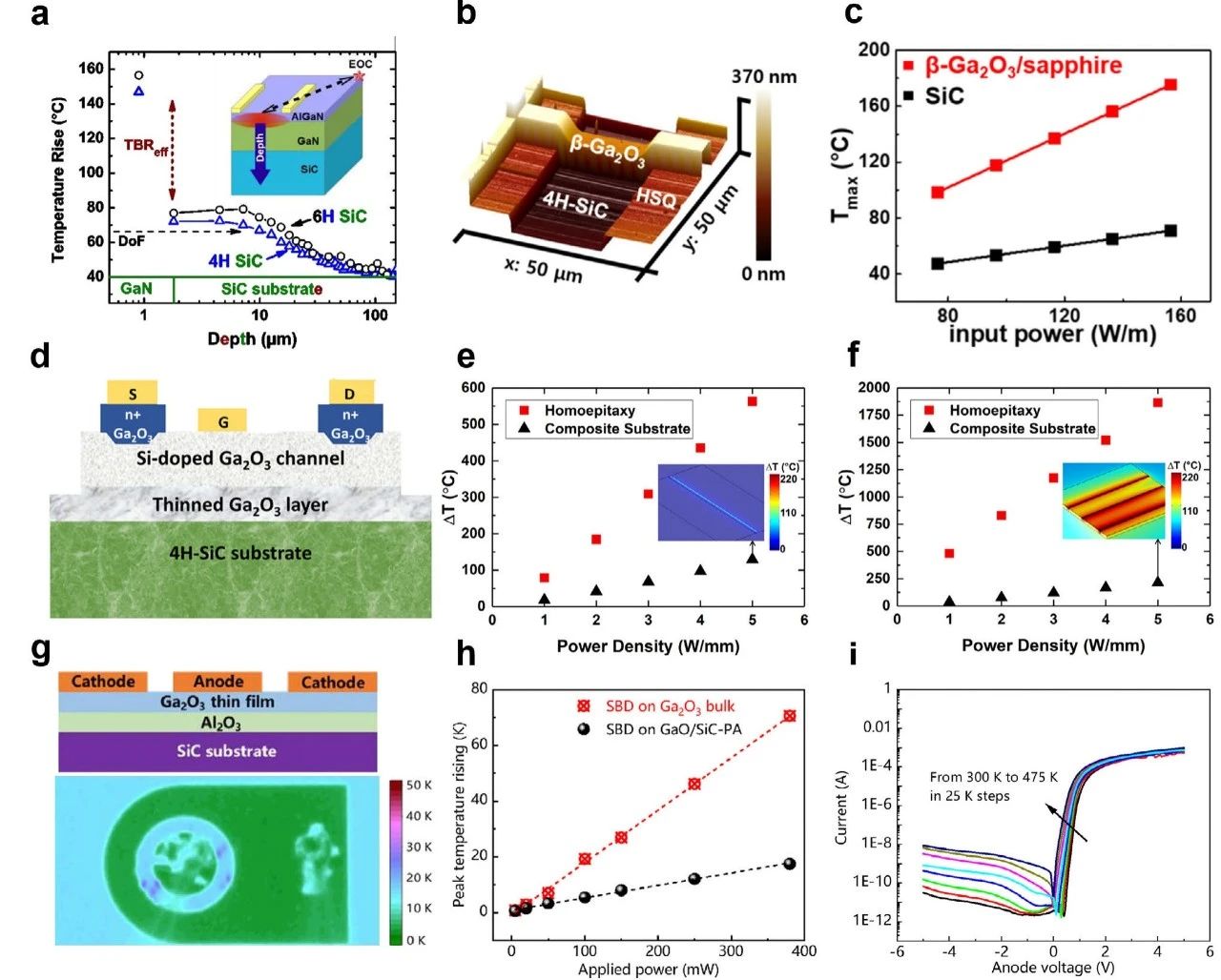 图6。(a)在30 W/mm功率密度下,碳化硅基底上氮化镓HEMT的温度随深度变化曲线。(b)4H-SiC基底上β -Ga2O3 FET的原子力显微镜图像。(c)不同基底下T随输入功率的变化关系。(d)Ga2O3 梅塞夫特结构示意图。(e)单指状(f)六指状及不同基底下Ga2O3 梅塞夫特在5 W/mm下的T 随功率密度变化曲线。(g)采用离子切割技术制备的Ga2O3 SBD基底表面温度图像(输入功率380mW)。(h)不同基底下峰值温度随施加功率变化曲线。(i)温度依赖性I-V特性。