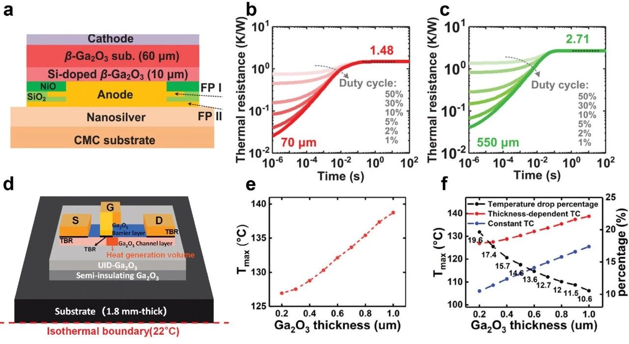 实测效果:Ga₂O₃ SBD(肖特基势垒二极管)衬底从 550μm 减薄至 70μm,热阻从 2.71 K/W 降至 1.48 K/W,降幅达 45%(如图 5 所示);仿真显示,Ga₂O₃厚度从 0.2μm 增至 1μm 时,相同功率密度下最高温度升高 12℃—— 厚度增加会进一步降低热导率,相当于 “路变窄了”。