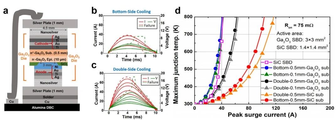 图16:(a)双面冷却倒装芯片封装的Ga₂O3 SBD结构示意图。(b)底部冷却与(c)双面冷却在浪涌电流实验中的电流电压波形对比。(d)10毫秒浪涌测试中峰值浪涌电流与最大结温的仿真关系曲线。