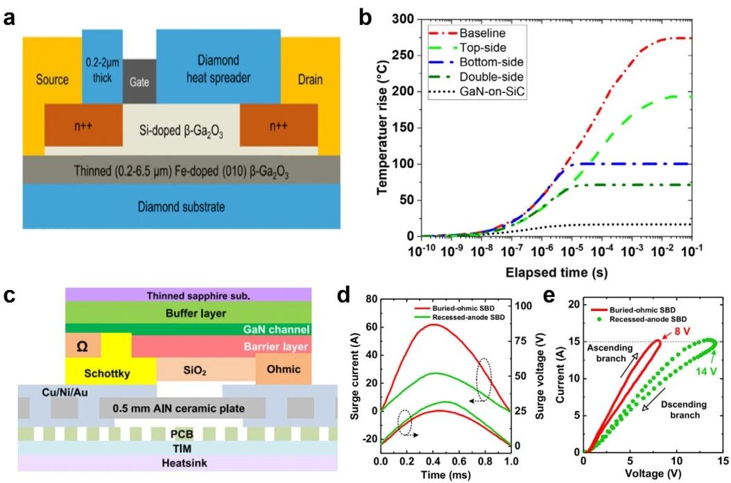 图17。(a)采用金刚石双面冷却的Ga2O3 MOSFET结构示意图。(b)4W/mm功率密度下的瞬态温升曲线,经授权转载 。(c)带倒装芯片封装的埋式欧姆SBD器件截面结构示意图。(d)应力持续时间1 ms时的埋式欧姆与凹陷阳极SBD浪涌电流特性曲线。