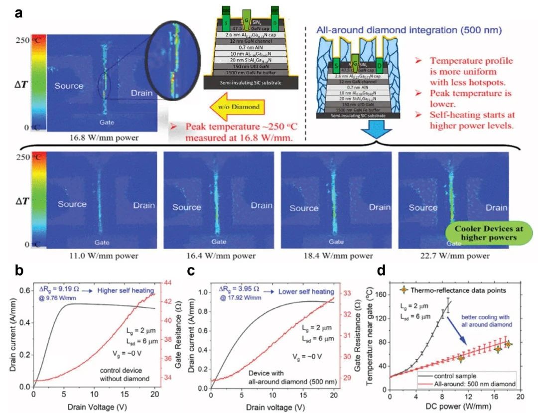GaN HEMT 案例:科研人员在器件表面沉积 50nm 厚的微晶金刚石(MCD)膜,25 W/mm 功率下温度降低 100℃,饱和电流和峰值跨导分别提升 2 倍、1.5 倍(如图 10 所示);