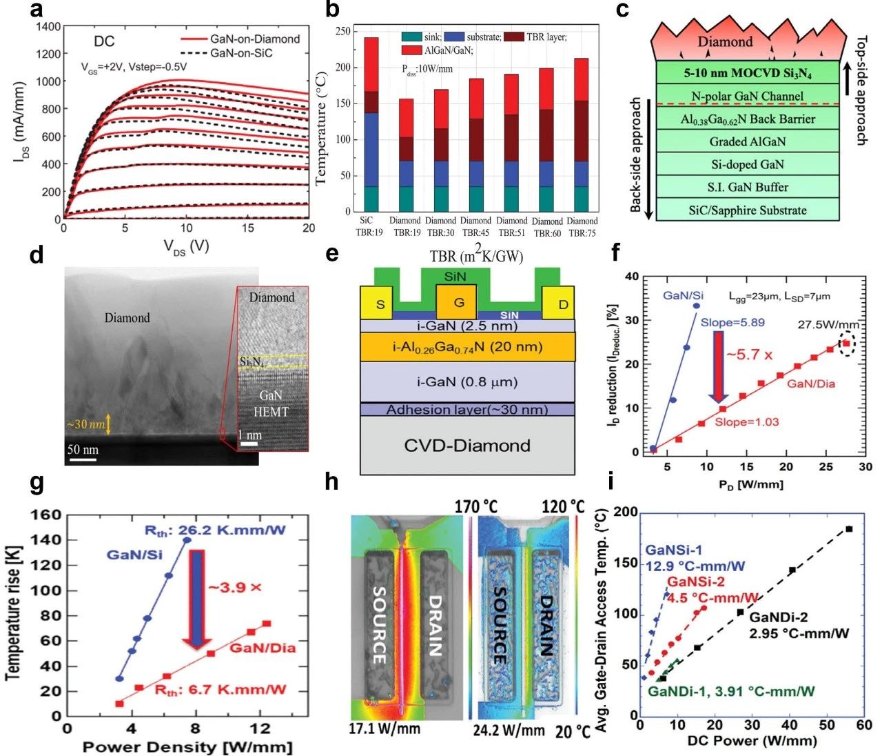 图8。(a)基板转移后氮化镓HEMT的输出特性。(b)不同热阻比(TBR)和基板条件下各层氮化镓HEMT在10 W/mm功率下的温升曲线。(c)顶部集成金刚石结构的n极性氮化镓HEMT截面示意图。(d)样品STEM显微图像显示30nm成核层和1nm 3 SiN4层。(e)晶体化学气相沉积法在金刚石基板上制备氮化镓HEMT的示意图。(f) I 减少曲线及(g)温升与功率密度关系图。(h)Si基板上氮化镓HEMT在17.1 W/mm直流输出功率下的稳态热反射图像(左),金刚石基板上氮化镓HEMT在24.2W/mm直流输出功率下的稳态热反射图像(右)。(i)栅极-漏极接触区平均温度变化与直流功率关系曲线。