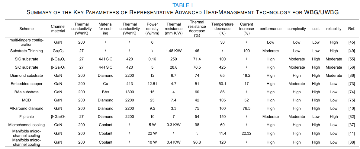 表I列举了先进热管理技术在WBG和UWBG器件中的应用最新研究的代表性成果。