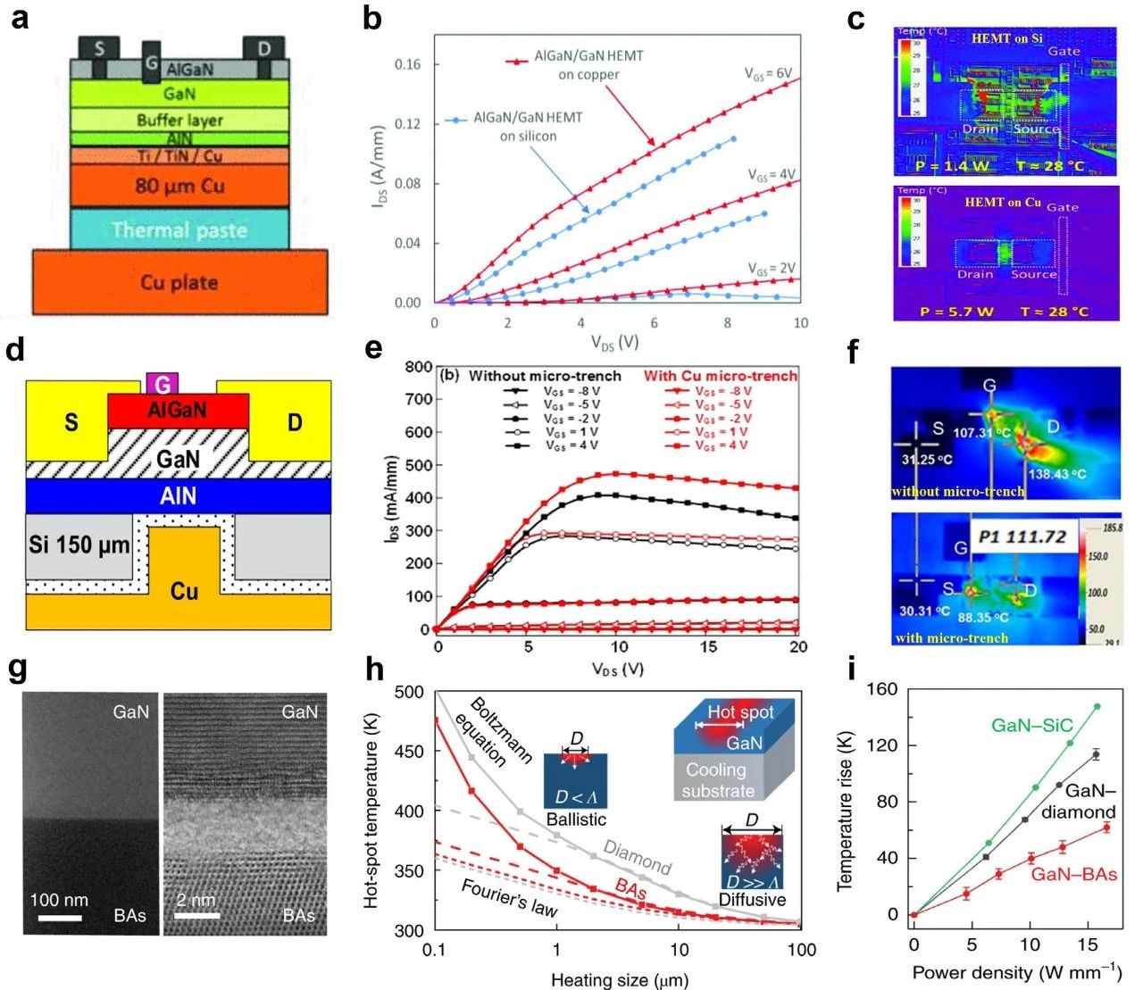 图9。(a)铜基底上氮化镓HEMT结构示意图。(b)I-V特性曲线。(c)用于对比的红外热成像图。(d)嵌入铜层的氮化镓HEMT结构示意图及对应(e)中的I-V特性曲线。(f)12W/mm功率密度下的热成像图。(g)铂基合金(BAs)上氮化镓HEMT的SEM左图与TEM右图截面对比。(h)两种最佳导热材料(铂基合金与金刚石)的热点温度随加热面积变化关系。(i)施加功率密度时的温升曲线。