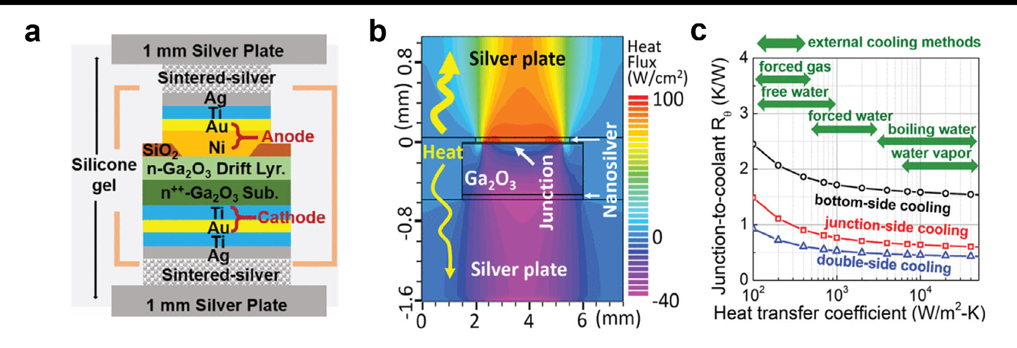 图13。(a)双面冷却的Ga2O3 SBD结构。(b)模拟热通量分布。(c)Ga2O3 SBD在底面冷却、结点冷却和双面冷却 下的模拟热阻。