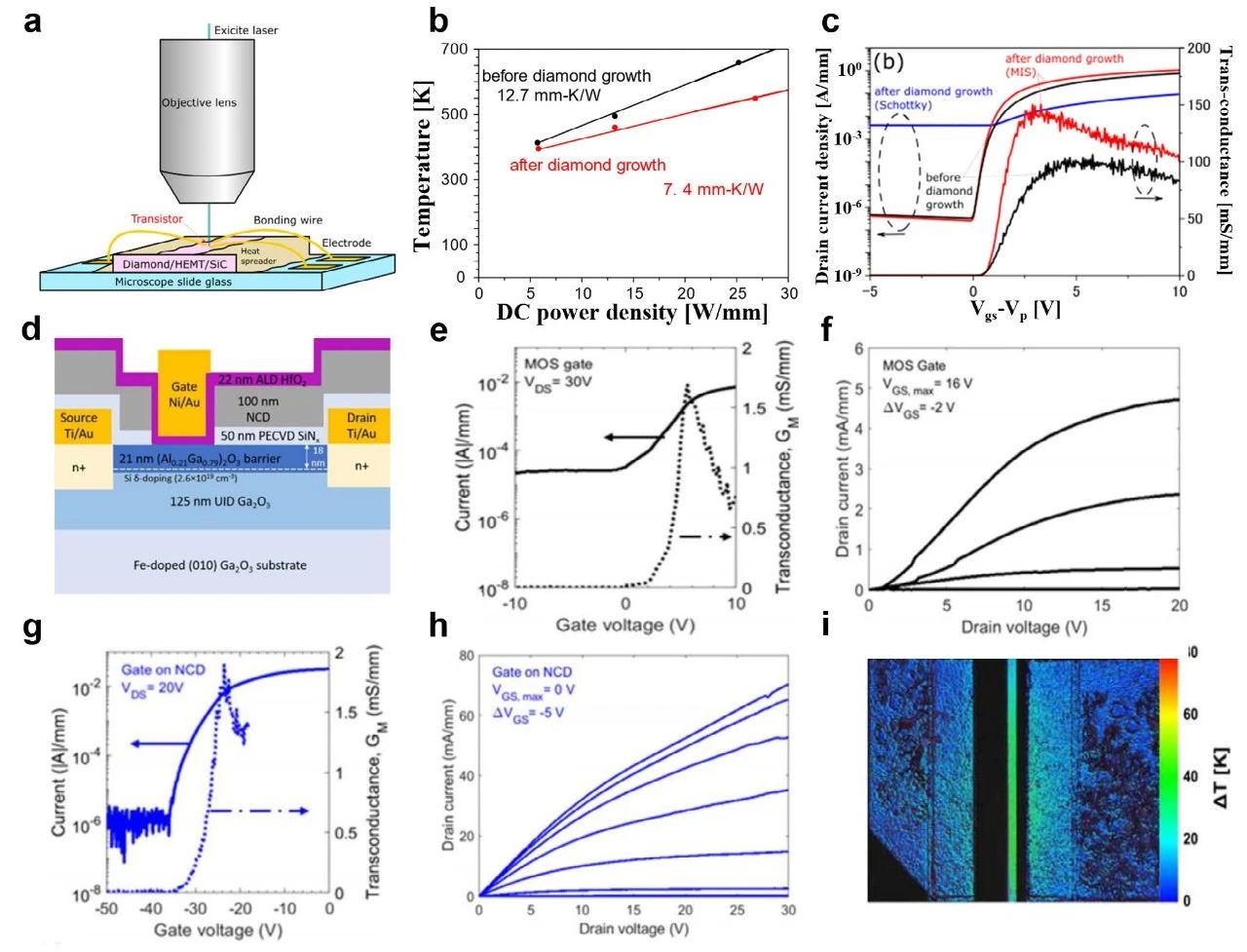 图10. (a)采用拉曼光谱系统对表面金刚石基氮化镓HEMT进行温度测量的示意图,(b)直流功率密度与最高温度的关系曲线,(c)传输特性对比图。(d)带有NCD热扩散层的β -Ga2 O3高氟3氧2》场效应晶体管(HFET)横截面结构,(e)和(f)分别为采用MOS/β NCD栅极时的直流传输特性,(g)和(h)输出特性对比((i))为功率密度1.5 W/mm时带NCD层的β -Ga2O3高氟氧晶体管热反射图像