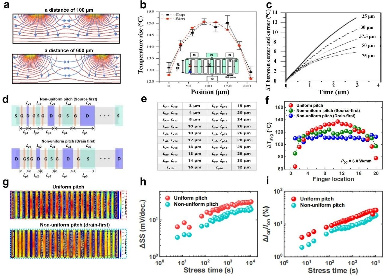 非均匀指间距:Jeong 团队设计 “中间疏、两边密” 的指距布局,平均表面温度降低 20℃,同时缓解了亚阈值摆幅(SS)和导通电流(I_ON)的退化。