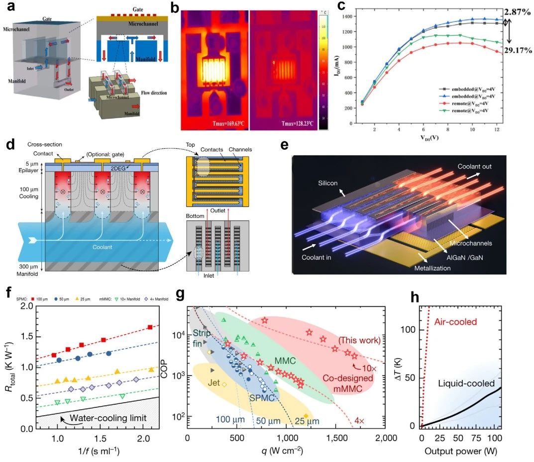 图15。(a)微通道传热设计原理图。(b)红外热成像温度读数显示V D为10V、 为2V时的测量结果。左侧展示远程冷却系统,右侧呈现嵌入式冷却方案。(c)I-V特性曲线对比图,经授权转载[41]。(d)带有复杂微通道冷却技术的氮化镓HEMT结构示意图。(e)单片集成歧管微通道结构(mMMC)内的流体流动可视化。(f)总热阻与流速关系曲线。(g)环境系数(COP)与60 ℃温升(q)下最大热通量的基准对比。(h)温度相关性能对比图.