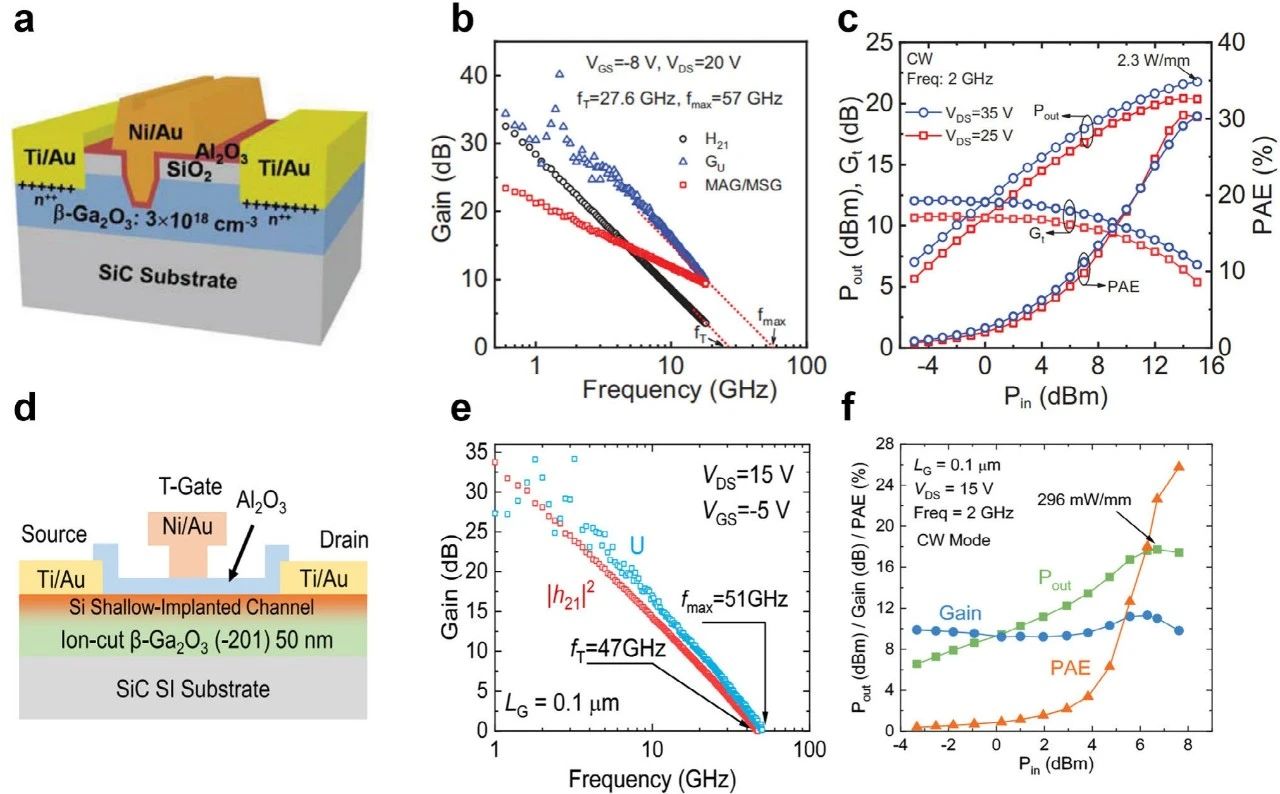 图7。(a)碳化硅基板上β -Ga2O3射频功率场效应晶体管结构示意图。(b)小信号射频特性曲线。(c)大信号AB类工作性能。(d)碳化硅基板上β -Ga2O3射频金属氧化物半导体场效应晶体管结构示意图。(e)小信号射频特性曲线。(f)在2GHz连续波模式下线性度Lg为0.1的大信号性能测试。