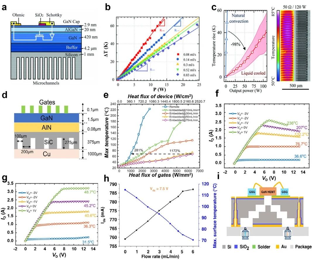 图14。(a)液冷氮化镓SBD结构示意图。(b)温差随直流功率密度变化曲线(流量范围0.08-0.83 mL/s)。(c)不同输出功率下的性能对比及表面温度分布。(d)嵌入式冷却技术的氮化镓HEMT结构示意图。(e)远程冷却与嵌入式冷却场景下的温度-热流关联性对比。I–V特性曲线分别对应(f)远程冷却和(g)嵌入式冷却在50 mL/min流量下的表现。经授权转载[92]。 (h) I 与最大表面温度随冷却液流量变化曲线。(i)采用微通道与TSV结构的氮化镓HEMT器件集成方案。