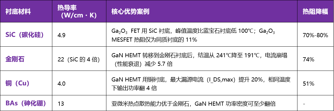 减薄解决了 “距离问题”,但衬底本身的导热能力也很关键。综述对比了四种主流高导热衬底的效果,数据一目了然: