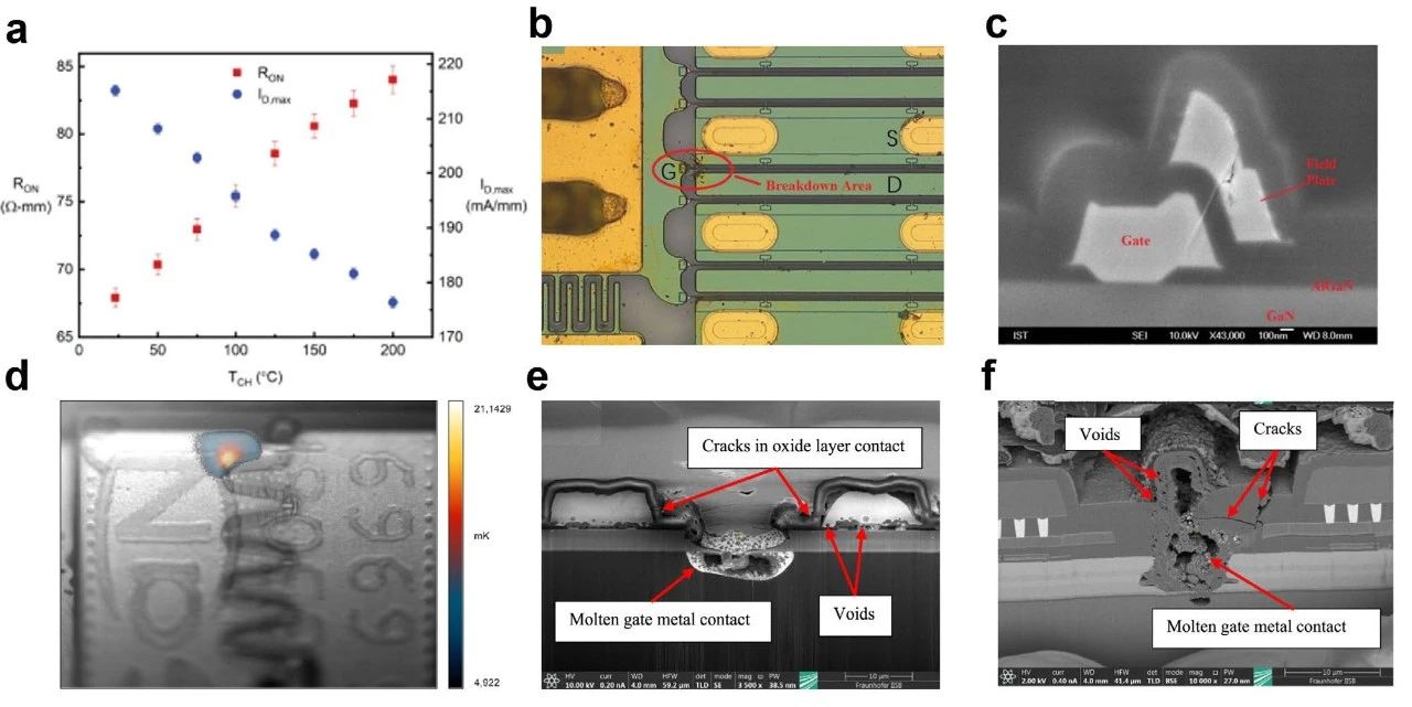 图2:(a)带有β -Ga2O3软沟道MOSFET的I 、 和 随温度变化曲线 。 (b) 氮 化 镓 HEMT(CGH-27015)的击穿面积。(c)热致聚集导致场极板出现裂纹。(d)氮化镓MISHEMT上的热点区域。(e) p-GaN HEMT和(f)氮化镓MIS-HEMT在无箝位电感开关(UIS)测试后的损伤区域。
