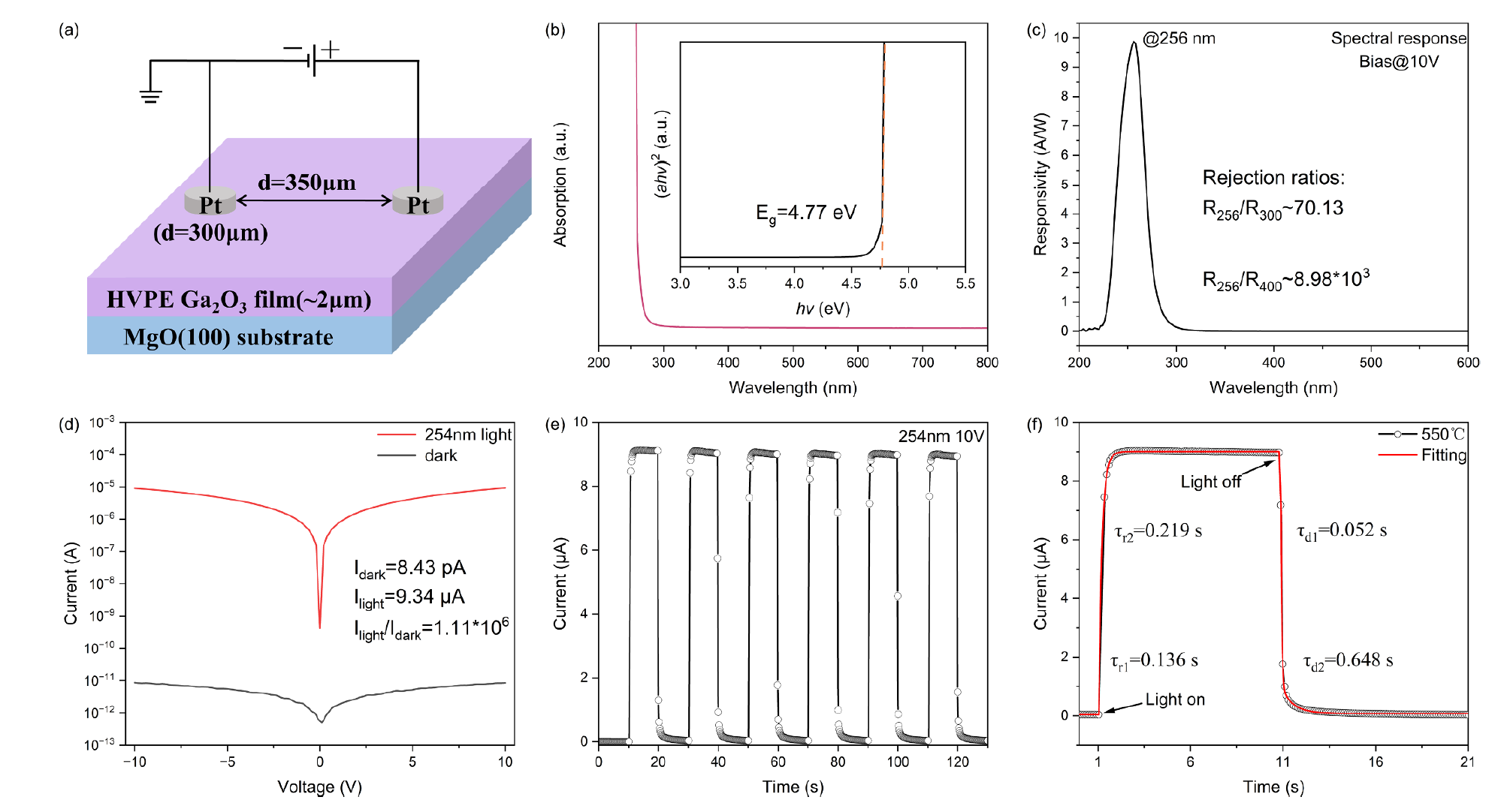 图4. 采用 550℃生长的β-Ga2O3薄膜所制备的光电探测器:(a)MSM 型光电探测器的原理图。(b)吸收光谱;图中插图展示了通过Tauc-plot推算出的相应光学带隙。(c)在 10V 偏压电压下的光谱响应。(d)在黑暗状态和 254nm 光照下的I-V 特性曲线。(e)在 254nm 光照下进行六次开/关循环后的时间响应曲线。(f)单个周期内的瞬态电流变化过程。
