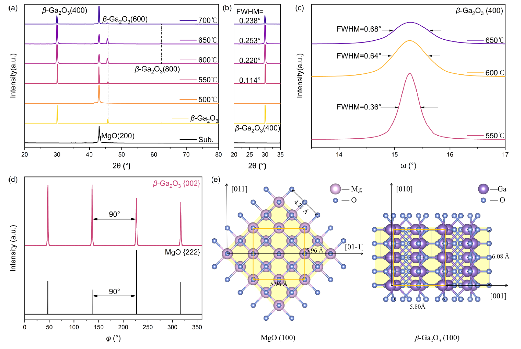 图1.不同温度下在MgO(100)衬底上沉积的β-Ga2O3薄膜的 XRD 图谱:(a)θ/2θ 扫描,(b)β-Ga2O3(400)衍射峰的半高宽,以及(c)β-Ga2O3(400)的摇摆曲线。(d)在 550℃下生长的薄膜MgO {222}和β-Ga2O3 {002}的面内XRD-φ扫描。(e)MgO(100)与β-Ga2O3(100)之间的原子排列及外延关系的示意图。