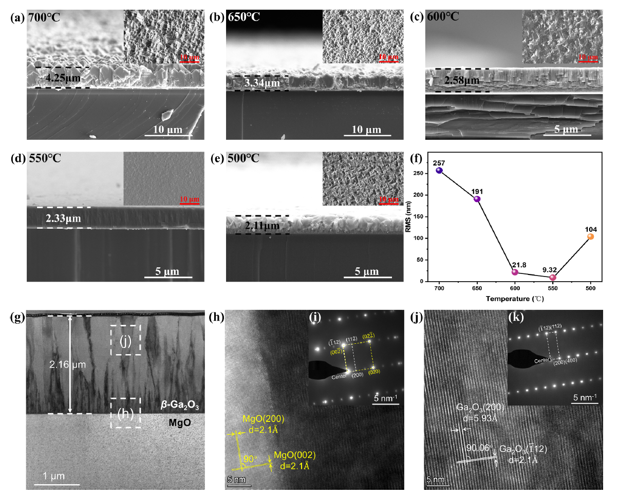 图2. 不同温度下生长的β-Ga2O3横截面和表面(图中插图所示)的扫描电子显微镜图像:(a)700℃;(b)650℃;(c)600℃;(d)550℃;(e)500℃。(f)随温度变化β-Ga2O3薄膜的表面粗糙度。在 550℃下沉积的β-Ga2O3薄膜的透射电子显微镜图像:(g)低分辨率透射电子显微镜图像。(h-k)薄膜(j),衬底及其界面(h)的高分辨率透射电子显微镜图像,以及相应界面(i)和薄膜(k)的电子衍射花样。