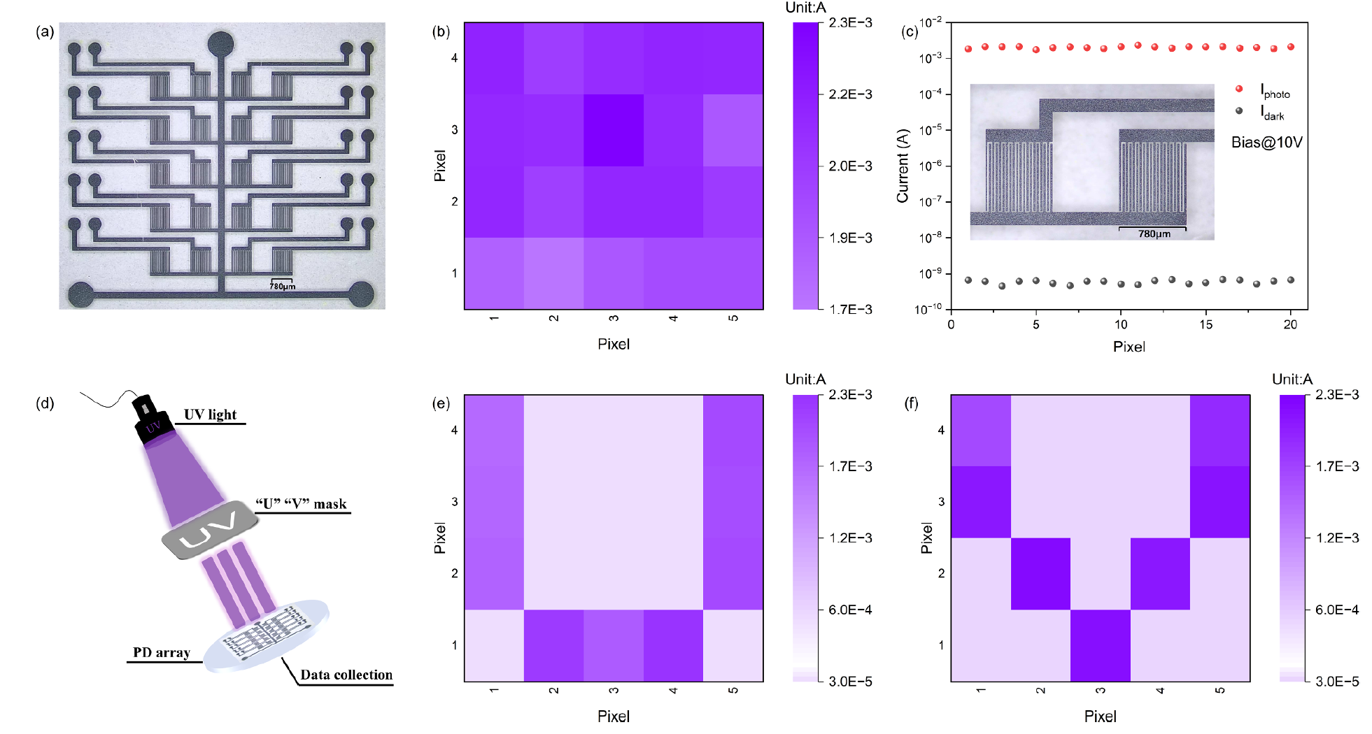 图 5.(a)光电探测器阵列实物图;(b)光电流分布图;以及(c)阵列内所有像素的暗电流和光电流;图中插图部分放大显示了(a)的细节部分。(d)SBUV 成像系统的原理图,以及(e)、(f)在 254nm光照下“U”“V”图案的相应成像结果。