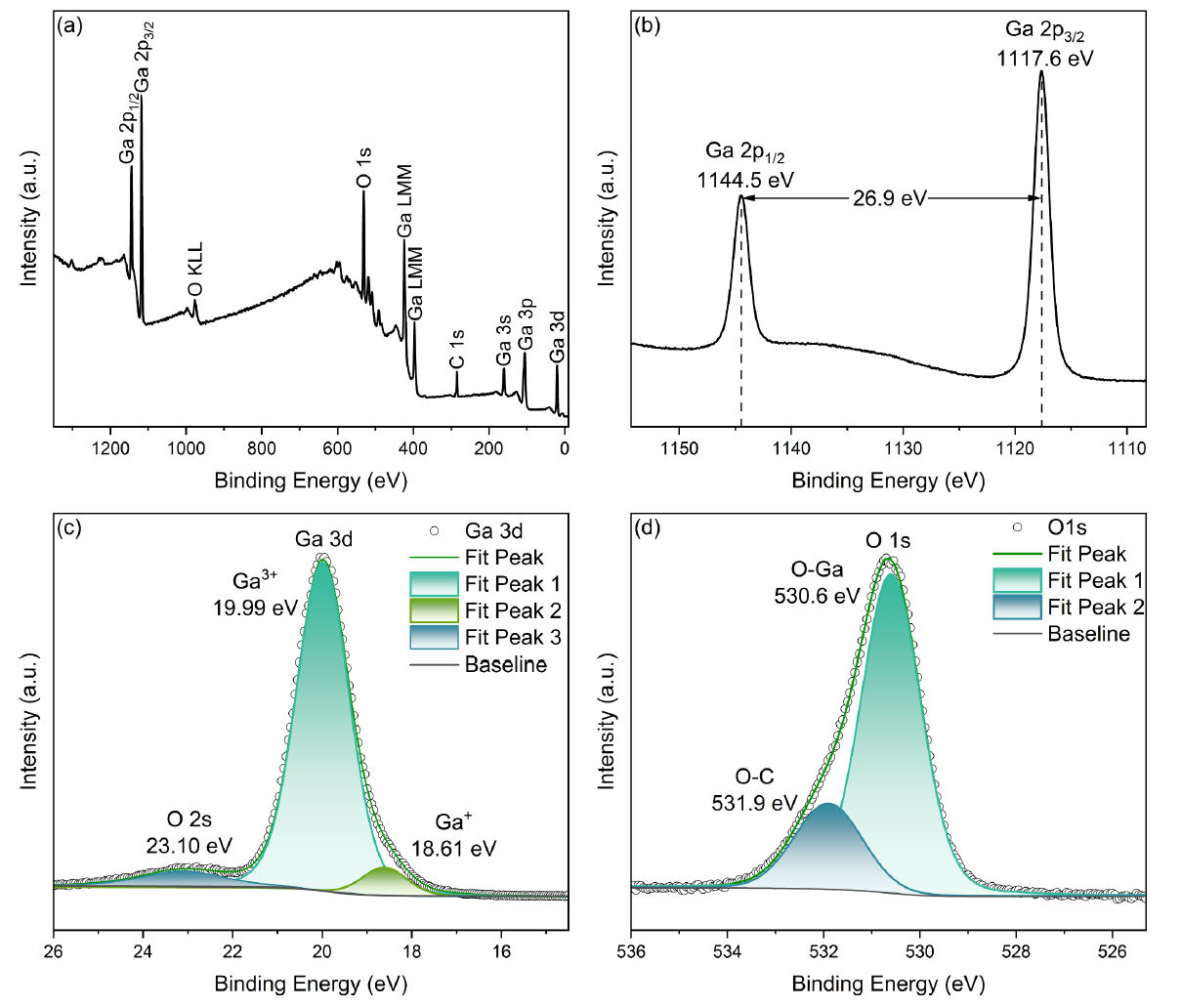 图3. 在 550℃下生长的β-Ga2O3薄膜的 XPS 光谱:(a)全谱,(b)Ga 2p 谱,(c)Ga 3d 谱,(d)O 1s 谱。