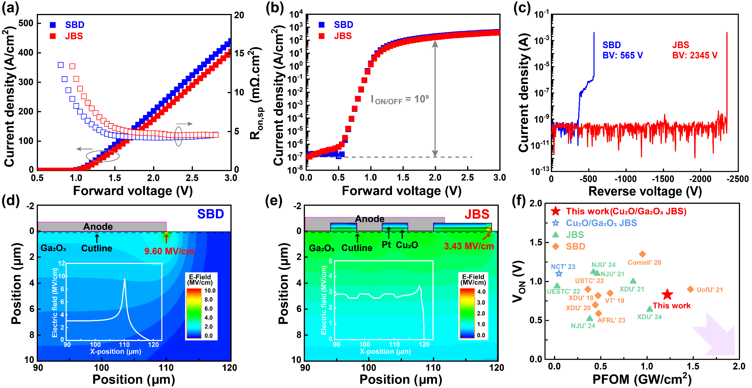 图 2. Ga2O3 SBD和JBS二极管(a)在线性尺度和(b)在对数尺度下的正向I-V特性。(c)两个器件的反向I-V特性。(d) SBD和(e) JBS二极管的模拟电场分布和相应的提取电场分布图。(f)已报道的最先进Ga2O3二极管的VON与PFOM的基准图。