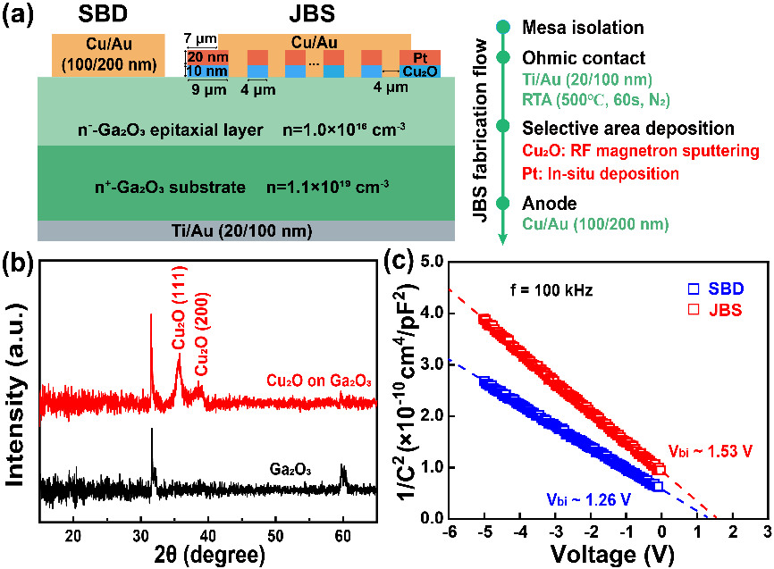 图 1. (a)以Cu为阳极的Ga2O3 SBD和JBS二极管的示意图和制备流程。(b) Ga2O3晶圆和沉积在Ga2O3上的Cu2O层的XRD谱图。(c) 100 kHz时1/C2-V测量结果。