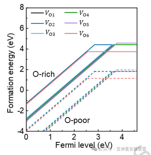 图 5|κ-Ga₂O₃ 中氧空位的形成能。在富氧与贫氧条件下,氧空位形成能随费米能级变化的关系。