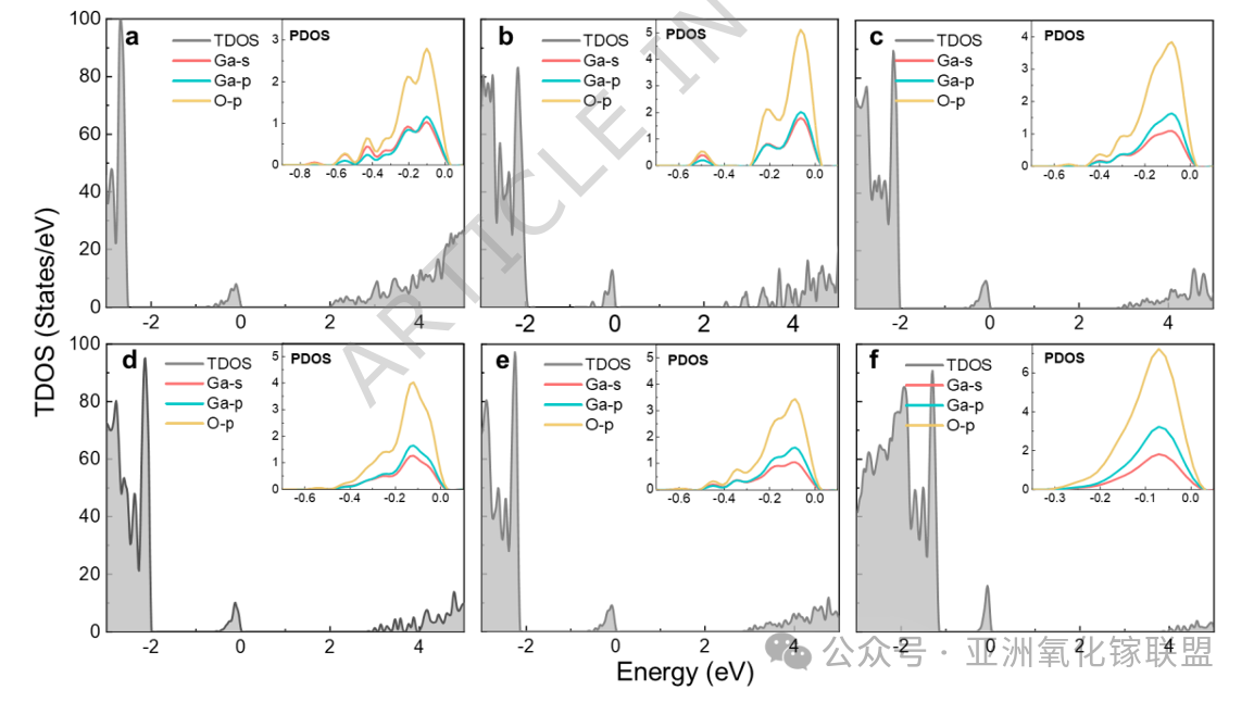 图 4|含氧空位 κ-Ga₂O₃ 的原子轨道投影态密度(PDOS)。分别给出了氧空位位于 (a) O1、(b) O2、(c) O3、(d) O4、(e) O5 和 (f) O6 位置时的原子轨道投影态密度(PDOS)。插图表示由氧空位引入的 PDOS。