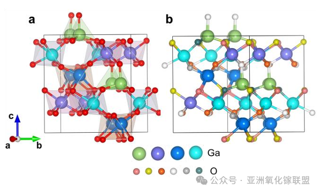 图 1|κ-Ga₂O₃ 的结构示意图。(a) κ-Ga₂O₃ 的常规晶胞;(b) κ-Ga₂O₃ 的 80 原子超晶胞。具有不同晶格位置的 Ga1–Ga4 原子分别以绿色、紫色、蓝色和青色球表示;具有不同晶格位置的 O1–O6 原子分别以粉色、黄色、红色、白色、灰色和深青色球表示。