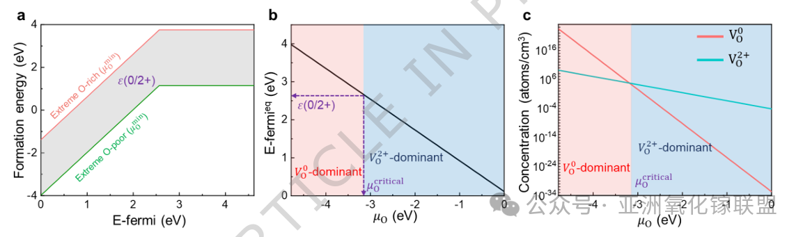 图 6|κ-Ga₂O₃ 中氧空位的热力学性质。(a) 低能量氧位点(VO6)处氧空位形成能随费米能级在不同生长条件下的变化关系,阴影区域表示极端富氧与贫氧条件之间的形成能范围;(b) 平衡费米能级(相对于价带顶,E-Fermieq – EVBM)随氧化学势的变化;(c) 中性与双电荷态氧空位的平衡浓度随氧化学势的变化关系。