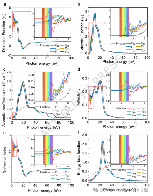 图 8|含中性氧空位 κ-Ga₂O₃ 的介电函数与光学性质分析。(a) 介电函数实部,(b) 介电函数虚部,(c) 吸收系数,(d) 反射率,(e) 折射率,以及 (f) 电子能量损失函数。