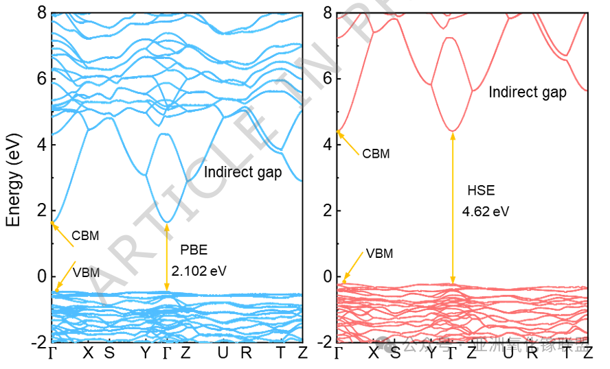 图 2|采用 PBE 与 HSE 方法计算的 κ-Ga₂O₃ 常规晶胞能带结构。分别给出了基于 PBE 近似和 HSE 杂化泛函计算得到的 κ-Ga₂O₃ 常规晶胞能带结构。