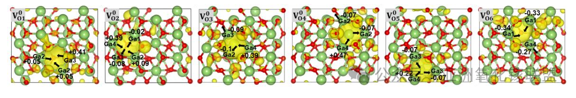 图 7|κ-Ga₂O₃ 中 VO0 的几何弛豫(Å)。κ-Ga₂O₃ 中中性氧空位 VO0 的几何结构弛豫情况,黄色阴影区域表示 HOMO 的实空间波函数分布。