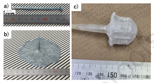 图2. (a) 经延长缩颈工艺生长的 β-Ga2O3 晶体,(b) 直径扩大试验获得的晶体,以及(c) 直径约 20 mm、晶体长度10 mm 的晶体。