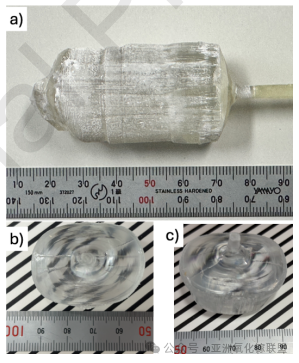 图3. (a) 直径 32 mm、长度 50.8 mm(2 英寸)的 β-Ga2O3 mm;(b)、(c) 直径 40 mm、长度 15 mm 的晶体。