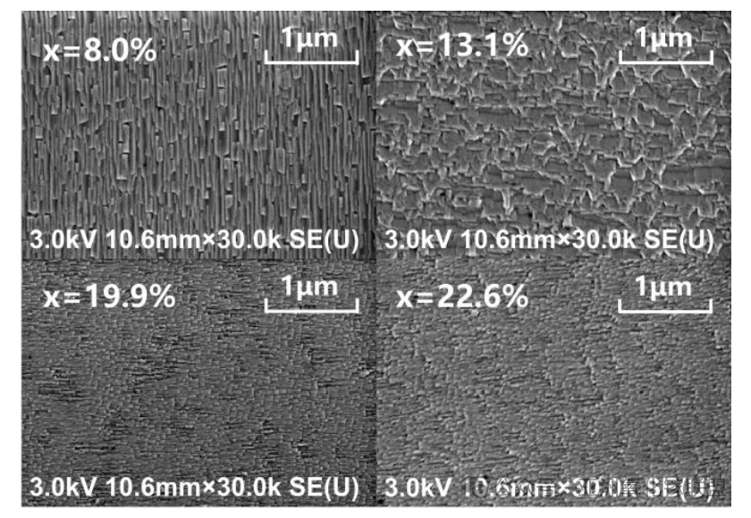 图2. Al 组分从 8.0% 到 22.6% 的 β-(AlₓGa₁₋ₓ)₂O₃ 薄膜的表面 SEM 图像。