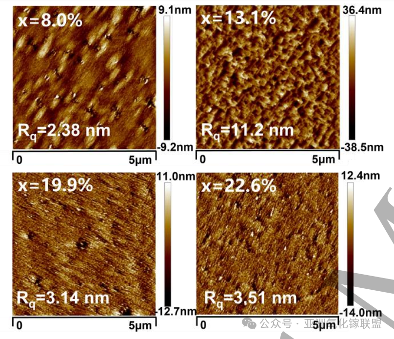 图3. Al 组分从 8.0% 到 22.6% 的 β-(AlₓGa₁₋ₓ)₂O₃ 薄膜的表面 AFM 图像。