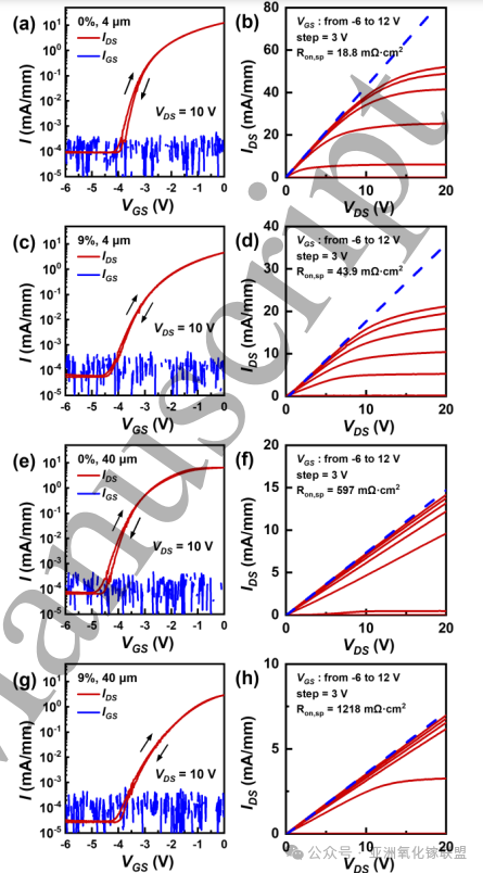 图6. 在 LGD = 4 μm 和 40 μm 条件下,Ga₂O₃ 与 (Al₀․₀₉Ga₀․₉₁)₂O₃ MOSFET 的转移与输出特性。(a)、(b)为 Ga₂O₃,LGD = 4 μm;(c)、(d)为 (Al₀․₀₉Ga₀․₉₁)₂O₃,LGD = 4 μm;(e)、(f)为 Ga₂O₃,LGD = 40 μm;(g)、(h)为 (Al₀․₀₉Ga₀․₉₁)₂O₃,LGD = 40 μm。