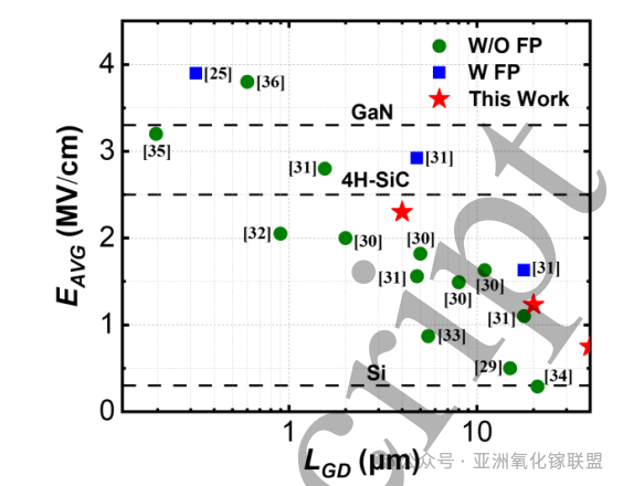 图8. 本工作器件的平均击穿场强 EAVG 与 LGD 的关系图,并与近期发表的 β-Ga₂O₃ 晶体管结果进行对比。