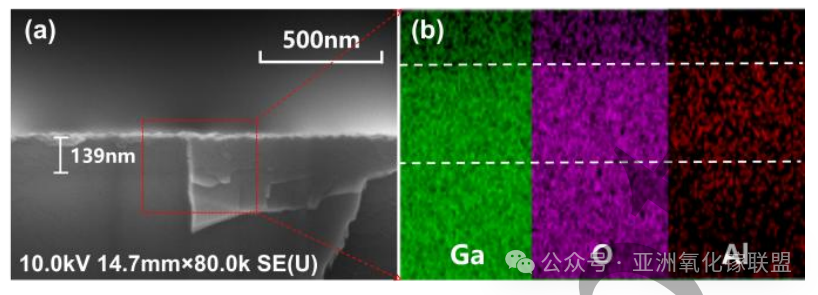 图4. (a) β-(Al₀․₁₉Ga₀․₈₁)₂O₃/β-Ga₂O₃ 异质结构的截面 SEM 图像。 (b) β-(Al₀․₁₉Ga₀․₈₁)₂O₃ 薄膜的截面 EDS 元素分布图。