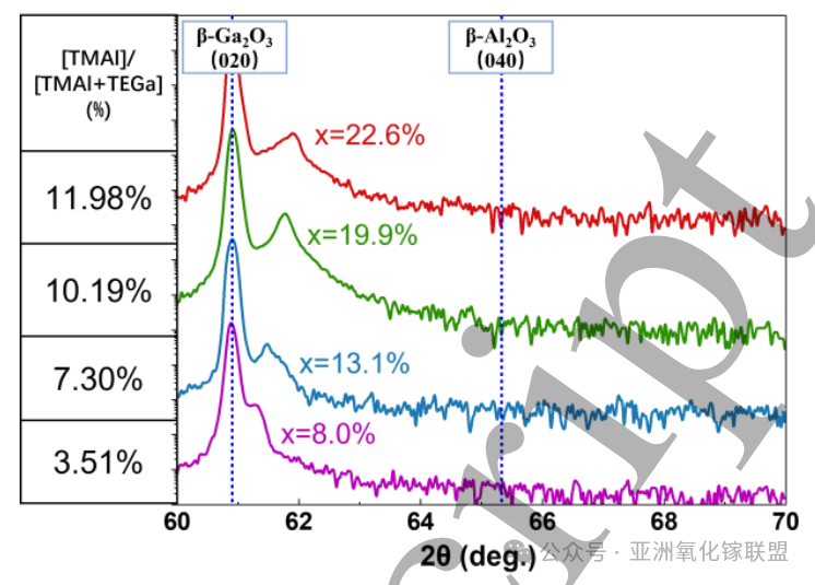 图1. 采用不同 [TMAl]/[TEGa + TMAl] 摩尔流量比(3.51%–11.98%)生长的 (010) β-(AlₓGa₁₋ₓ)₂O₃ 外延膜的 XRD ω-2θ 扫描图。