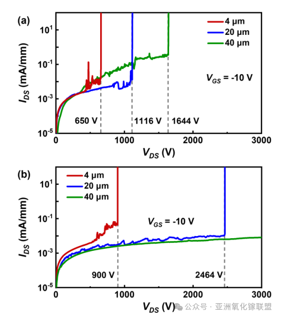图7. 在 LGD = 4、20、40 μm 条件下,基于 (a) Ga₂O₃ 和 (b) (Al₀․₀₉Ga₀․₉₁)₂O₃ 外延薄膜制备的 MOSFET 的三端关断态击穿特性。