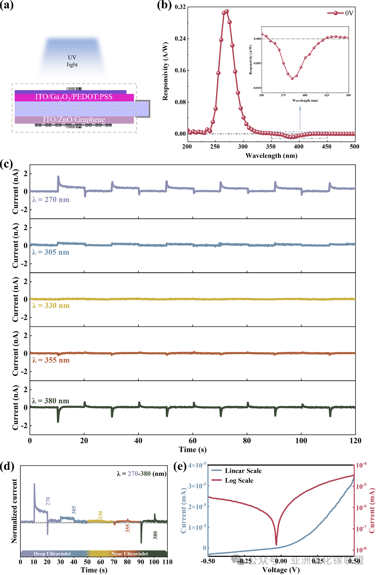 图5. (a) 垂直堆叠(背靠背)复合器件示意图。(b) 光谱响应曲线。(c) 270 nm 至 380 nm 波段测得的 I-t 特性曲线。(d) 不同波段下 I-t 响应形态演变示意图。(e) 暗态下测得的 I-V 特性曲线。
