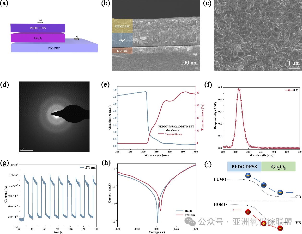 图4. (a) ITO-PET/Ga2O3/PEDOT:PSS 器件示意图。(b) 截面扫描电子显微镜图像与(c)平面扫描电子显微镜图像。(d) Ga2O3 薄膜透射电子显微镜衍射图。(e) 吸收光谱。(f) 光谱响应度。(g) I-t 特性曲线。(h) 器件工作原理示意图。(e) 吸收光谱。(f) 光谱响应度。(g) I-t 特性曲线。(h) I-V 特性曲线。(i) 器件工作原理示意图。