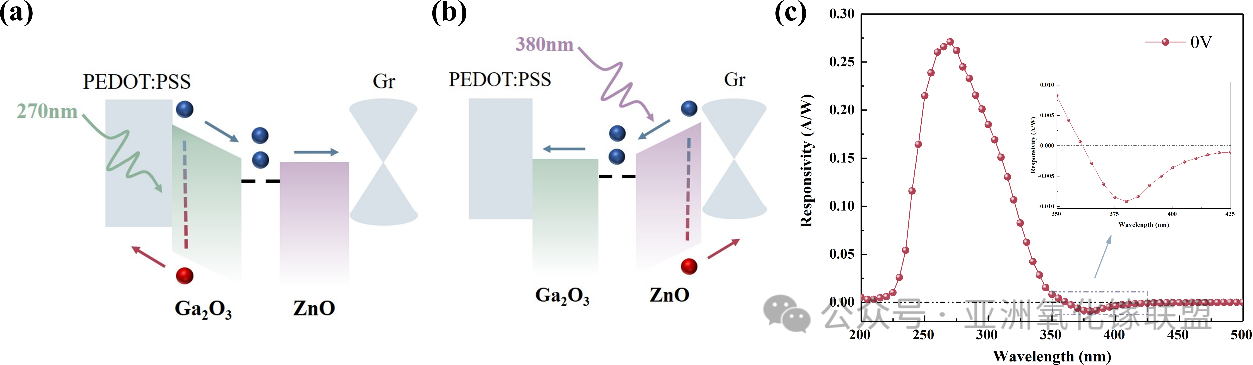 图6. 复合结构在不同紫外激发波长下产生正负光电流的机理:(a)270 nm 照射;(b)380 nm 照射。(c) 采用 ITO-PET/MgZnO/PEDOT:PSS 与 ITO-PET/ZnO/石墨烯制备的复合器件的光谱响应曲线,验证该机制的普适性。