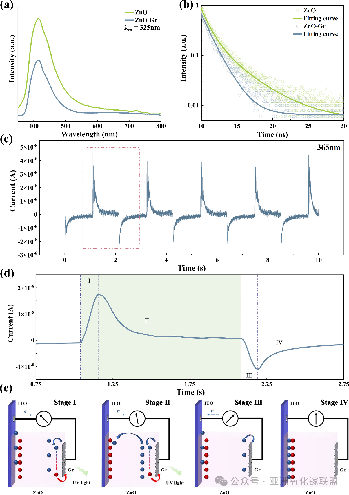 图3. (a) 原始 ZnO 薄膜与 ZnO/石墨烯异质结的稳态光致发光谱;(b) 瞬态光致发光衰减曲线。(c) 器件在 0.5 Hz 脉冲频率下响应 365 nm 光照的电流-时间响应曲线。(d) 经平滑处理的电流-时间曲线,详细展示单个响应周期。(e) ZnO/石墨烯 PDC 单元工作机制示意图,详细展示 I-II 阶段(受光照)与 III-IV 阶段(光照关闭状态)。