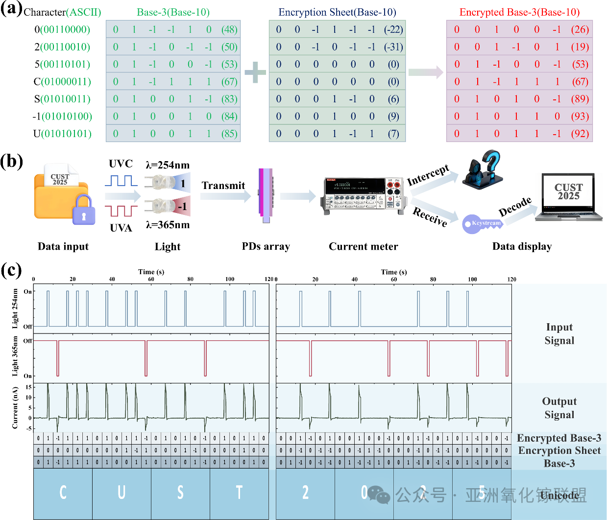 图7. (a) 三元加密编码方案示例。(b) 完整光通信系统示意图。(c) 输入信号、双极光电探测器对应输出信号及信息解码过程示意图。