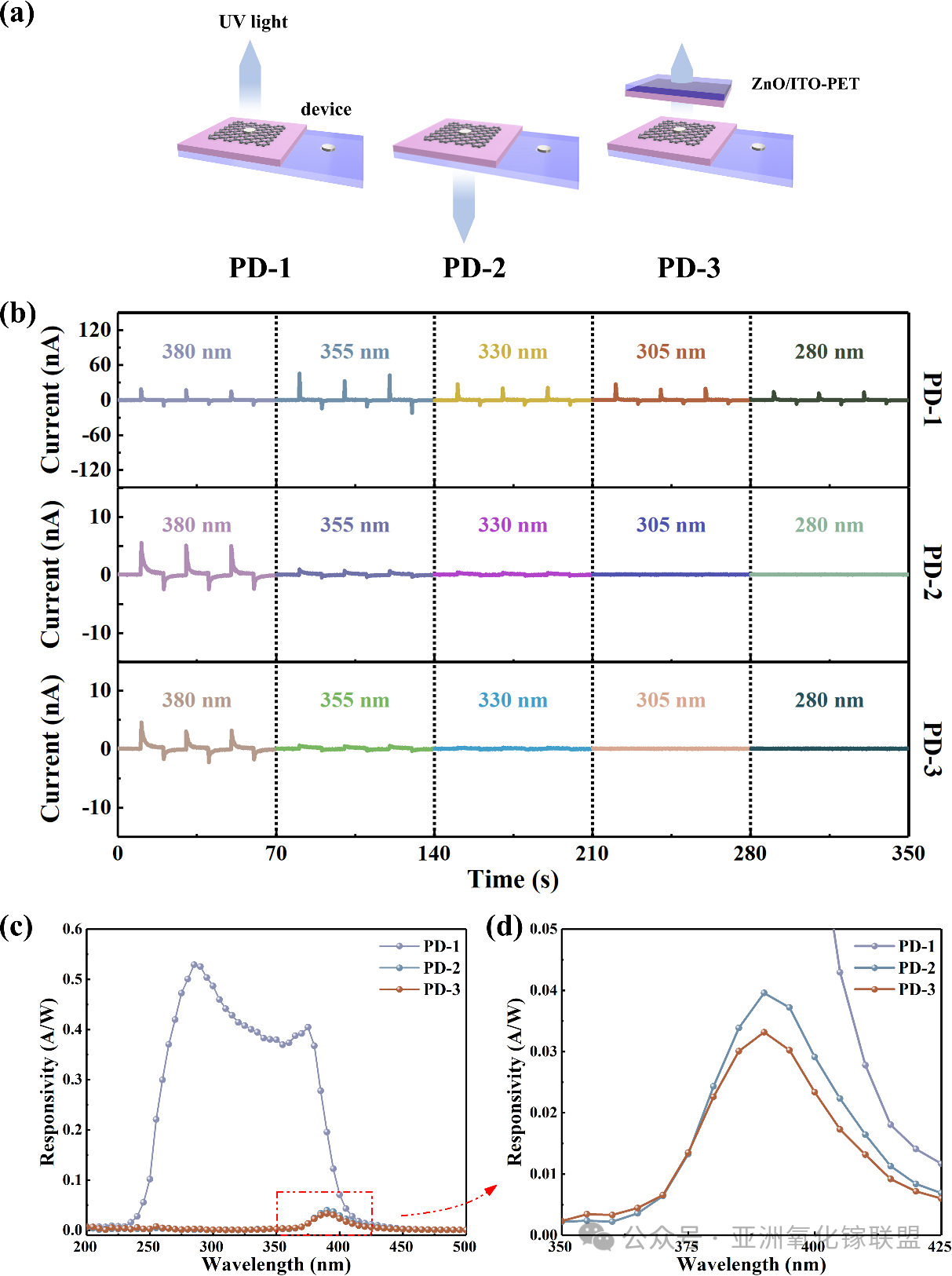 图2. (a) ITO-PET/ZnO/石墨烯器件的三种不同照明配置(PD-1 至 PD-3)示意图。(b) 该器件在三种配置下的 I-t 曲线及 (c) 对应响应度(测量波长范围 280 nm 至 380 nm)。(d) 350–425 nm 波段响应度的放大视图。