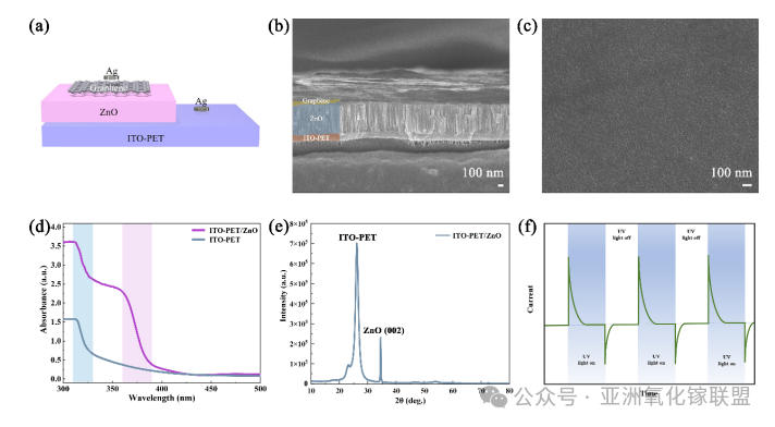 图1. (a) ITO-PET/ZnO/石墨烯器件示意图。(b) 器件截面图及 (c) 平面扫描电子显微镜图像。(d) 裸 ITO-PET 基板与 ITO-PET/ZnO 样品的吸收光谱,(e) X 射线衍射图谱。(f) ITO-PET/ZnO/石墨烯器件的 I-t 特性曲线。