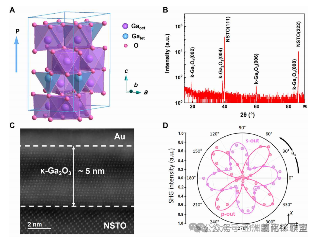 图1. 铁电κ-Ga2O3的外延稳定化与结构验证。(A)κ-Ga2O3晶体结构显示沿[001]方向的可切换极化,Ga原子占据四面体(GaO4/Gatet)和八面体(GaO6/Gaoct)配位位点,这些位点协同实现极化翻转。(B)NSTO(111)衬底上5nm κ-Ga2O3薄膜的高分辨XRD θ-2θ扫描,仅存的(00l)衍射峰证实了相纯的外延生长。(C)截面STEM图像显示κ-Ga2O3/NSTO界面原子级陡峭且无第二相。(D)二次谐波(SHG)极坐标图证明非中心对称晶体结构,实验数据(点)与理论拟合(线)共同确认mm2点群对称性,与铁电行为一致。a.u.表示任意单位。