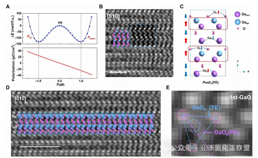 图4. 铁电转换的原子尺度机制。(A) 极化转换路径的DFT计算显示能量势垒为26.4 meV/原子,PE表示顺电态,FE表示铁电态。(B) 沿[010]晶带轴的IDPC-STEM图像,模拟结构(蓝色叠加)与实验数据匹配,证实了Pna21极性对称性,比例尺为1纳米。(C) 极化反转过程中协同的八面体-四面体转变示意图,如电影S1所示,Gaoct表示八面体配位的Ga(GaO6),Gatet表示四面体配位的Ga(GaO4)。(D和E) 放大显示FE-PE相变过程中第一Ga层的结构畸变,其中(D)所示区域与图S14A相同,(D)突出结构畸变而图S14提供定量位移分析,比例尺为2纳米。